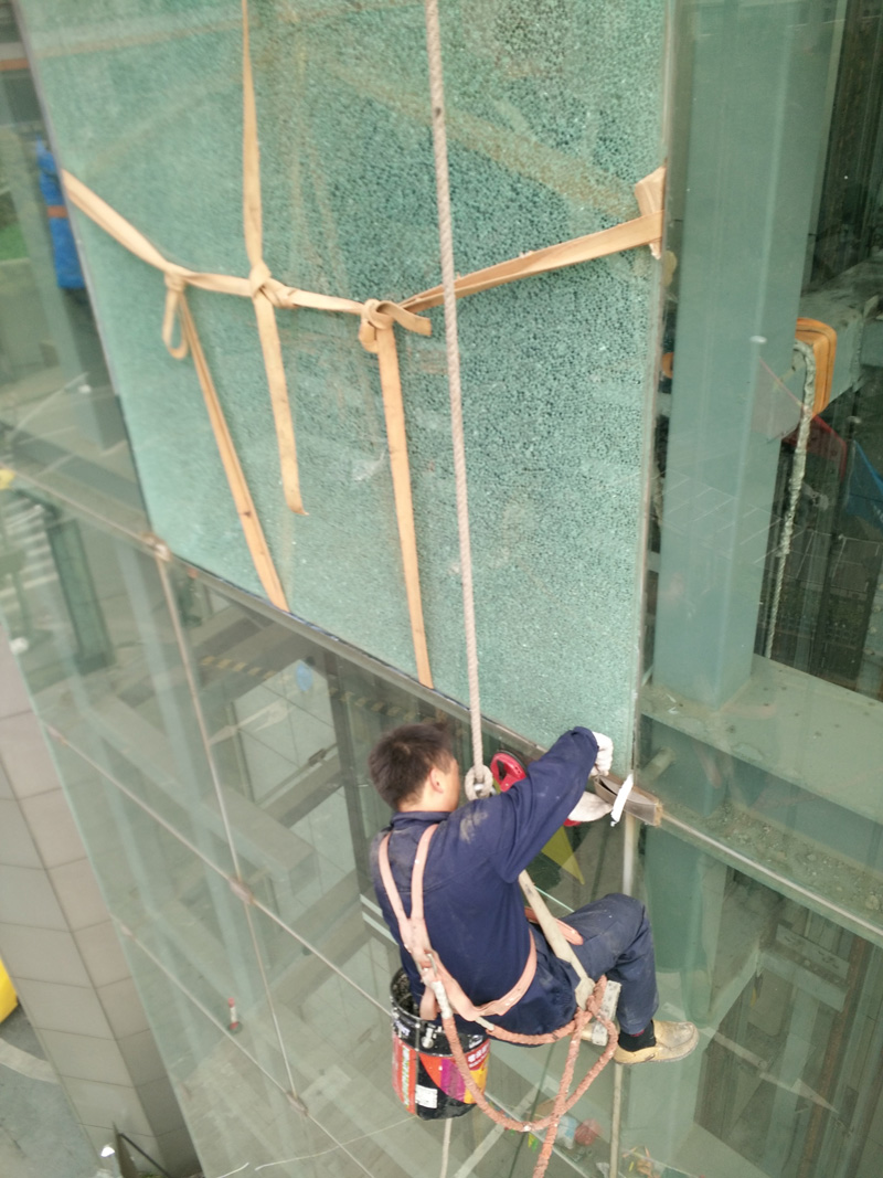 在施工期間的保護(hù)。在施工中通常是用鮮艷的小旗、彩飾帶子等懸掛在玻璃附近或貼附在窗框前方、側(cè)柱或窗臺(tái)上以標(biāo)記出這是安裝玻璃的空間。決不要讓繩索直接觸到玻璃,并且也不要讓記號(hào)或涂料直接畫(huà)在玻璃表面上,如果焊接、切割噴沙或者其他可能損傷玻璃的建筑工藝在接近玻璃的地方采用,則必須應(yīng)用膠合板或塑料板作為一層嚴(yán)密的隔離層板以防止它們影響以至損壞玻璃。